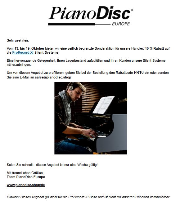 Verwenden Sie den Code PR10 und erhalten Sie 10 % Rabatt auf das ProRecord XI Silent-System. Nur gültig vom 13. bis 19. Oktober 2025 – seien Sie schnell!