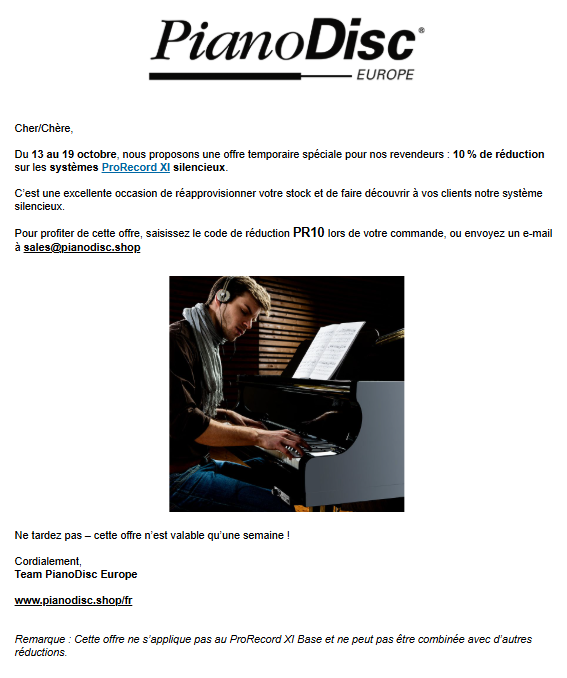 Utilisez le code PR10 et bénéficiez de 10 % de réduction sur le système ProRecord XI Silent. Offre valable uniquement du 13 au 19 octobre 2025 – ne tardez pas !